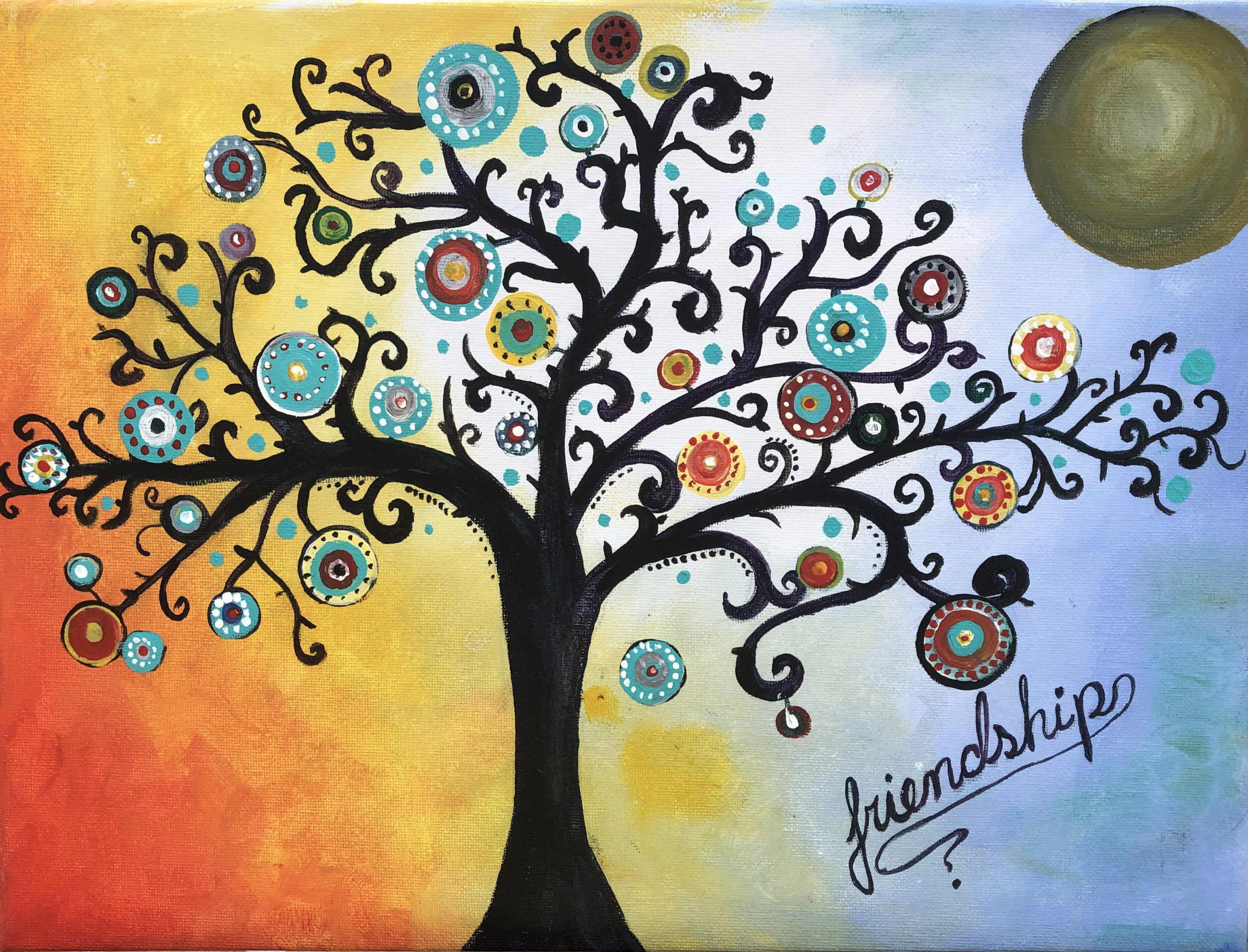 Omdat een familiestamboom er bijna altijd strak en geometrisch uitziet wilde ik een soort van tegenhanger maken voor de vriendschapsboom. Ik hoop dat je er net zo vrolijk van wordt als ik tijdens het schilderen. Ideaal als cadeau voor een beste vriend of vriendin. – LAURA