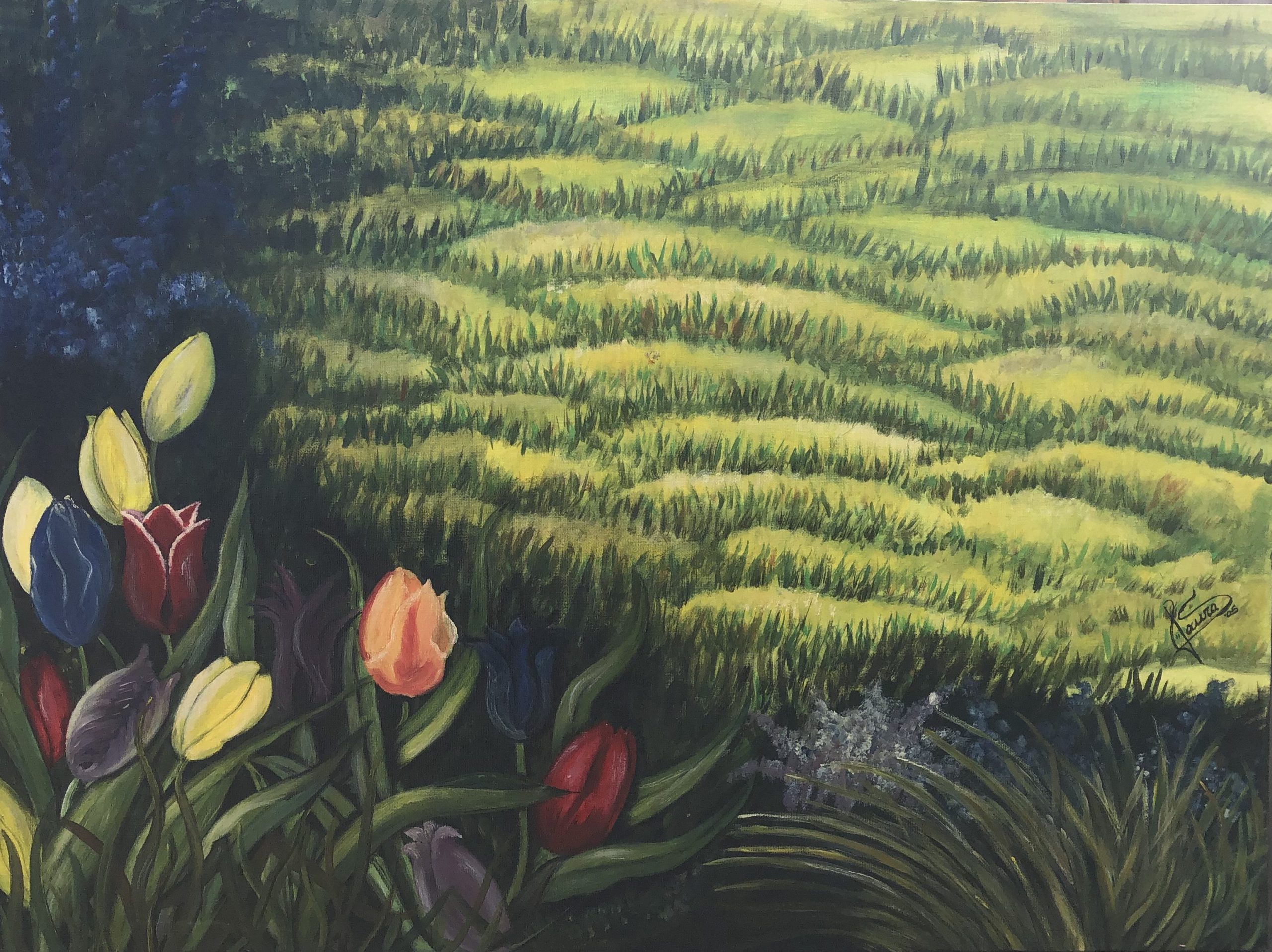De tulpen in de hoek van dit schilderij geven extra kleur aan mijn leven